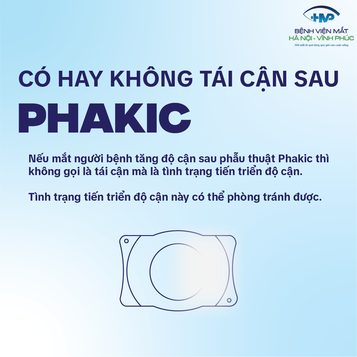 Đối với phẫu thuật Phakic, độ cận của người bệnh được xử lý nhờ việc đặt thấu kính nội nhãn có độ khúc xạ phù hợp vào mắt, do vậy người bệnh thay vì đeo kính gọng để nhìn rõ thì sẽ được thay thế bởi cặp thấu kính nội nhãn đặt ẩn sau mống mắt và trước thủy tinh thể. Khi tháo thấu kính ra, mắt người bệnh sẽ trở lại trạng thái cận thị ban đầu, do vậy nếu sau phẫu thuật Phakic, mắt người bệnh tăng độ cận thì sẽ không gọi là tái cận mà đó là tình trạng tiến triển độ cận.